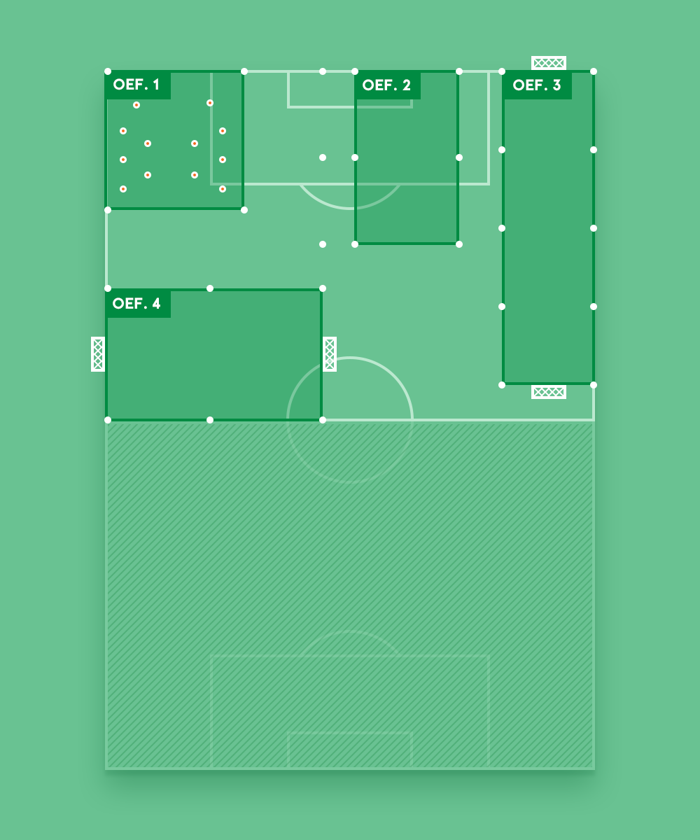 Noteer de afmetingen van de veldjes en maak groepen van minimaal 8 spelers. Na een centraal eindsignaal, draaien alle groepen met de klok mee naar de volgende oefening.